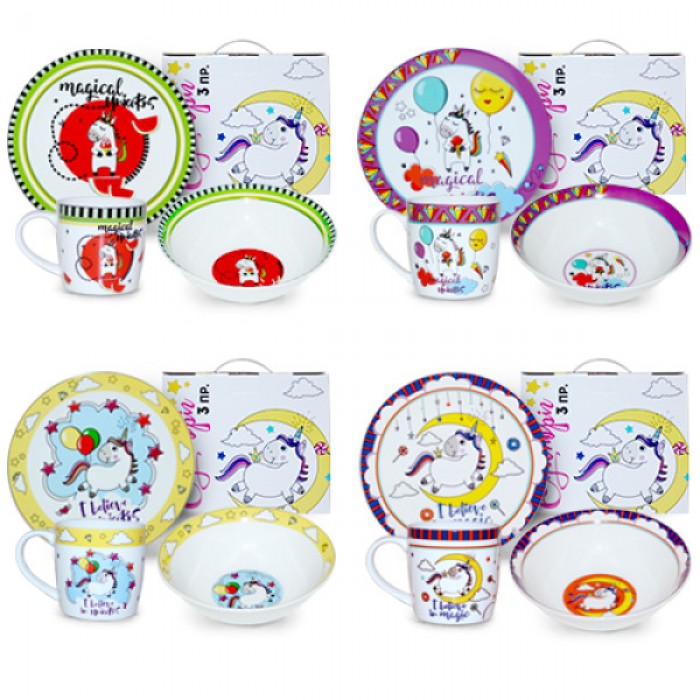 Набір дитячий 3пр. Єдиноріг мікс (тарілка-19см, миска 380мл, чашка-250мл) в асортименті 5144