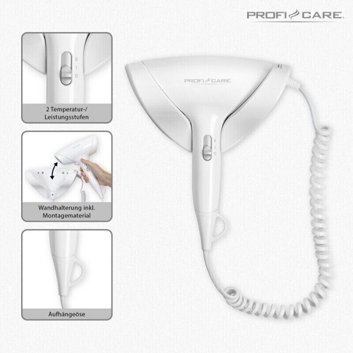 PROFICARE PC-HT 3044 с двумя уровнями нагрева и 2 скоростями крепится к стене посредством настенного держателя. Корпус изготовлен из высококачественного пластика белого цвета. Для удобной эксплуатации модель соединяется с базой мягким спиральным шнуром, который практически незаметен в работе. В PROFICARE PC-HT 3044 реализована система автоматического отключения. Когда Вы возвращаете фен на базу он автоматически отключается, что повышает безопасность его эксплуатации. Удобное крепление позволит с легкостью снимать и устанавливать обратно без каких-либо усилий.