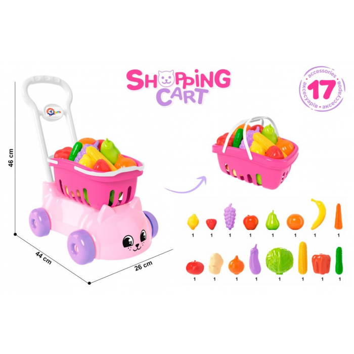 У наборі: візок з ручкою, кошик, 16 овочів та фруктів.