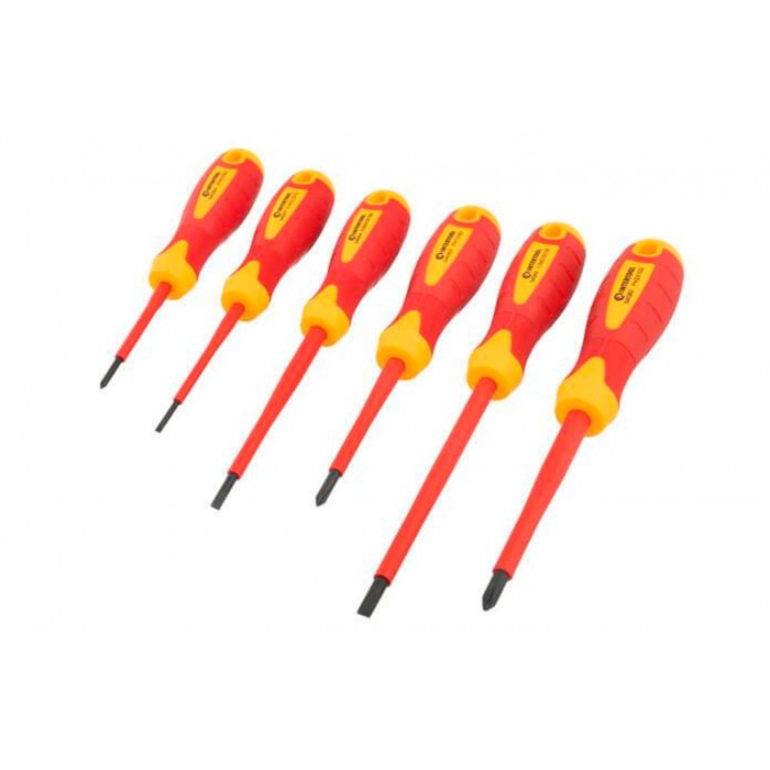 Диэлектрическое покрытие стержней отверток обеспечивает полную защиту от поражения током, изолированные рукоятки с удобным хватом для надежности проведения работ. Предназначены для работ с крепежами, находящимися под напряжением до 1000В. Прошли заводской контроль качества на сертифицированном европейском оборудовании. Изготовлены из Cr-V стали. Комплектация: Отвертки: SL0.4*2.5*75мм, SL0.8*4.0*100мм, SL1*5.5*125мм, PH0*60мм, PH1*80мм, PH2*100мм Количество в наборе: 6 ед.; Рабочая длина: 60, 75, 80, 100, 125 мм; Напряжение: 1000 В