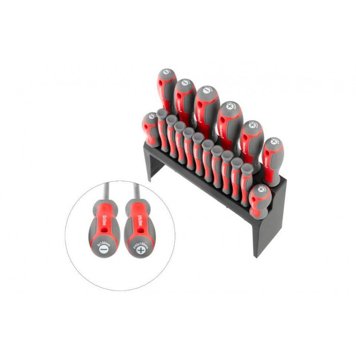 Набор отверток изготовлен по последним технологиям и соответствует высоким запросам мастеров. Предназначен для монтажа и демонтажа резьбовых соединений с типом шлица: SL2,5, SL3, SL5, SL6, SL8, PH0, PH1, PH2, PH3, T5, T6, T7, T8, T9, T10. Комплект станет отличным помощником в домашнем арсенале инструмента, а также в собственной мастерской, на производстве. Высокое качество стали Стержень отверток изготовлен из прочной Cr-V стали, которая известна всем мастерам своей надежностью и выносливостью. В составе этой стали присутствуют хром и ванадий, которые придают изделию высокую стойкость к износу. Также сталь отличается долговечностью и не подвержена хрупкому разрушению. Конструкция отверток продумана до мелочей Стержень глубоко посажен в рукоятку и крепиться в двух местах, что исключает возможность срыва. Намагниченный наконечник Отвертки имеют усиленный магнитный наконечник, который удерживает крепеж и облегчает работу в труднодоступных местах. Удобная рукоятка Форма ручек обеспечивает максимальную эффективность от приложенного усилия. Прорезиненная двухкомпонентная рукоятка удобно лежит в руке и не выскальзывает из ладони. Яркая маркировка на конце рукоятки позволяет быстро найти необходимый тип и размер отвертки. Отвертки укомплектованы в специальный держатель для хранения. Вы можете поставить набор на любой стол или полку, а также подвесить на стену (предусмотрены отверстия для крепления). Комплектация Отвертки: SL2.5*50мм, SL3*50мм, SL5*75мм, SL6*38мм, SL6*100мм, SL8*150мм, PH0*50мм, PH00*50мм, PH1*75мм, PH2*38мм, PH2*100мм, PH3*150мм, T5*50мм, T6*50мм, T7*50мм, T8*50мм, T9*50мм, T10*50мм Материал рукояток: TPR резина; Длина отвертки: 38, 50, 75, 100, 150 мм; Количество в наборе: 18 ед.; Материал стержня отвертки: Cr-V сталь