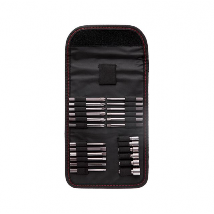 Отвертка реверсивная со сменными битами: SL3, SL4, SL5, SL6, SL7, PH0, PH1, PH2, PH3, T10, T15, T20, T25, T27, T30, PZ1, PZ2, PZ3 и шестигранные головки: 5, 6, 7, 8, 9, 10 мм. Количество насадок: 26 ед.