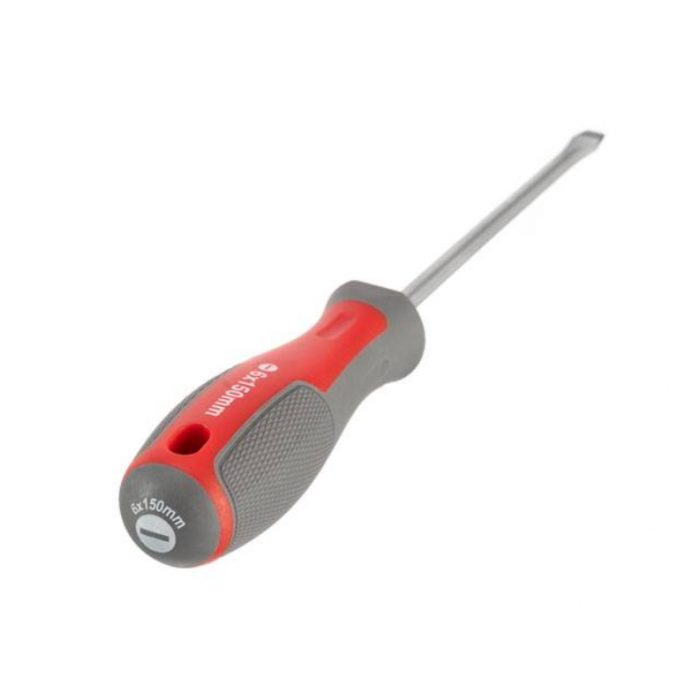 Отвертка изготовлена по последним технологиям и соответствует высоким запросам мастеров. Предназначена для монтажа и демонтажа резьбовых соединений с типом шлица SL6. Такая отвертка станет отличным помощником в домашнем арсенале инструмента, а также в собственной мастерской, на производстве. Высокое качество стали Стержень отвертки изготовлен из прочной Cr-V стали, которая известна всем мастерам своей надежностью и выносливостью. В составе этой стали присутствуют хром и ванадий, которые придают изделию высокую стойкость к износу. Также сталь отличается долговечностью и не подвержена хрупкому разрушению. Конструкция отвертки продумана до мелочей Стержень глубоко посажен в рукоятку и крепиться в двух местах, что исключает возможность срыва. Намагниченный наконечник Отвертка имеет усиленный магнитный наконечник, который удерживает крепеж и облегчает работу в труднодоступных местах. Удобная рукоятка Форма ручки обеспечивает максимальную эффективность от приложенного усилия. Прорезиненная двухкомпонентная рукоятка удобно лежит в руке и не выскальзывает из ладони. Яркая маркировка на конце позволяет быстро найти необходимый тип и размер отвертки. Материал стержня отвертки: Cr-V сталь; Материал рукоятки: двухкомпонентная, прорезиненная; Длина отвертки: 150 мм