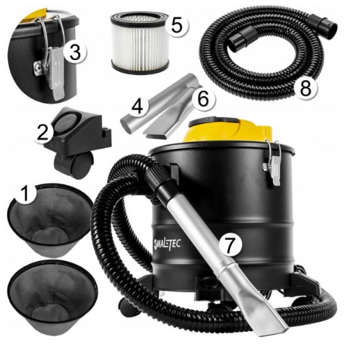 Устройство оснащено термостойкой алюминиевой трубкой для сбора пыли, термостойким резервуаром, гибким шлангом из очень прочного материала, наполненным металлической, спиральной и термостойкой структурой. Пылесос имеет удобную ручку для переноски и HEPA-фильтр, который защитит возможность вентиляции всасываемой пыли.